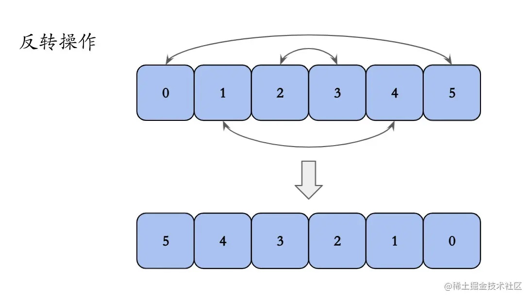 下图以数组长度为6,数据为0、1、2、3、4、5,反转整个数组举例。