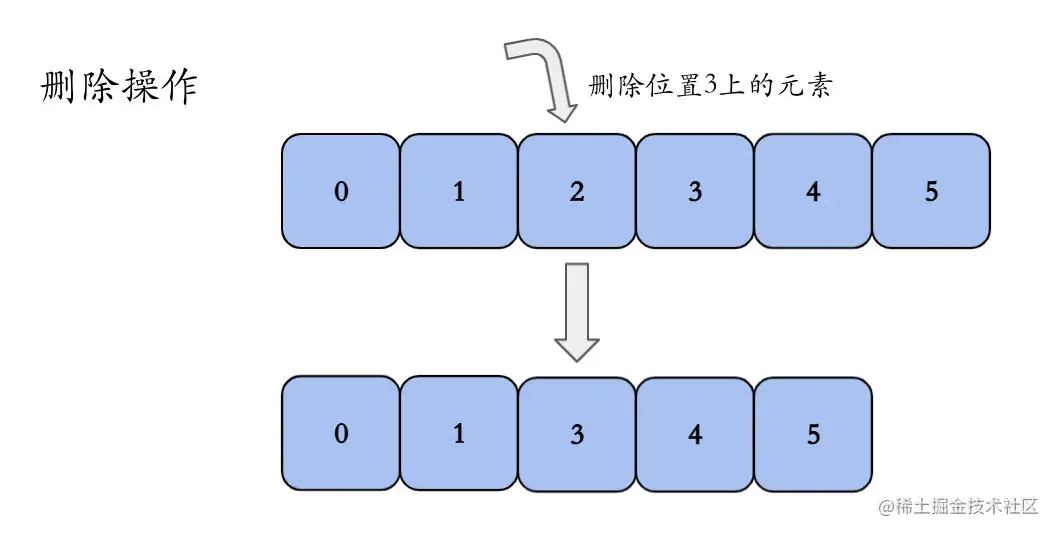 下图以数组长度为6,数据为0、1、2、3、4、5,删除位置3上的元素X举例。