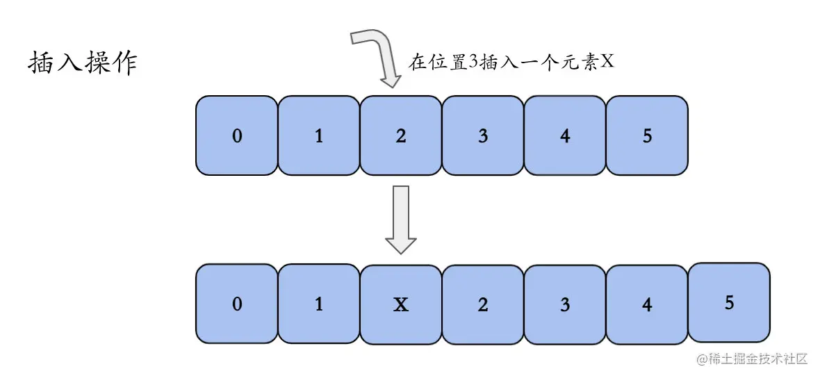 下图以数组长度为6,数据为0、1、2、3、4、5,在位置3插入一个元素X举例。