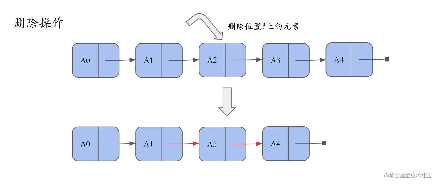 下图是以长度为5的链表,删除位置3上的元素为例子。