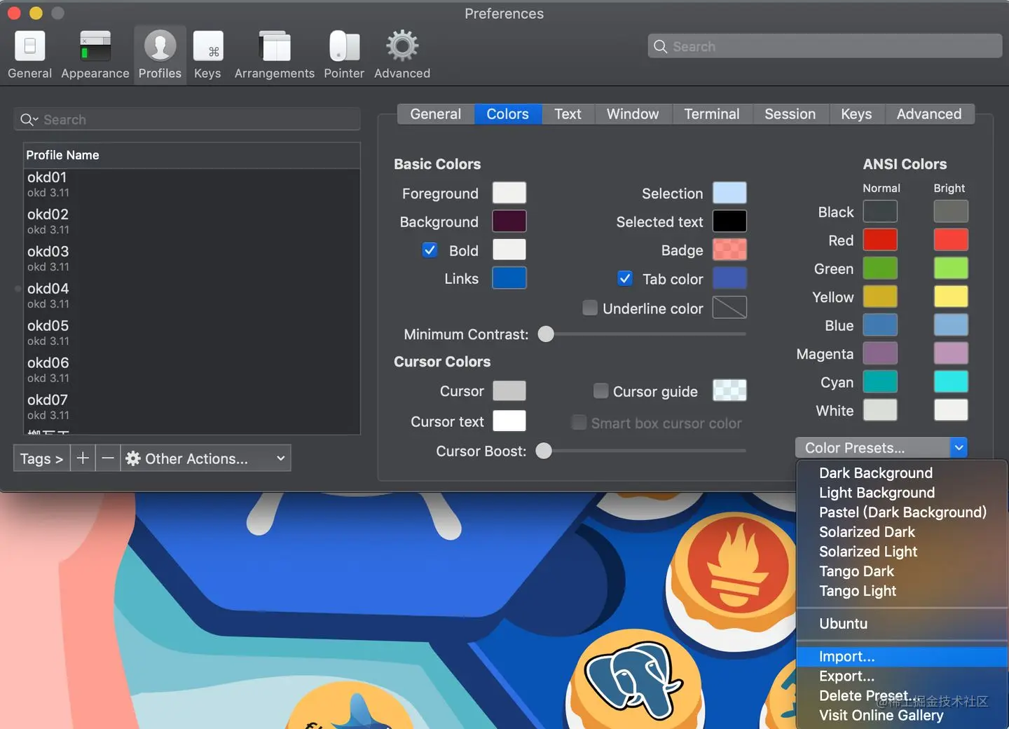 下载压缩包,解压后,打开 iTerm2 的设置:Preperence → Profiles → Colors → Color Presets。点击 import 选择解压好的主题目录下 schemes 目录下的你想要的主题导入。