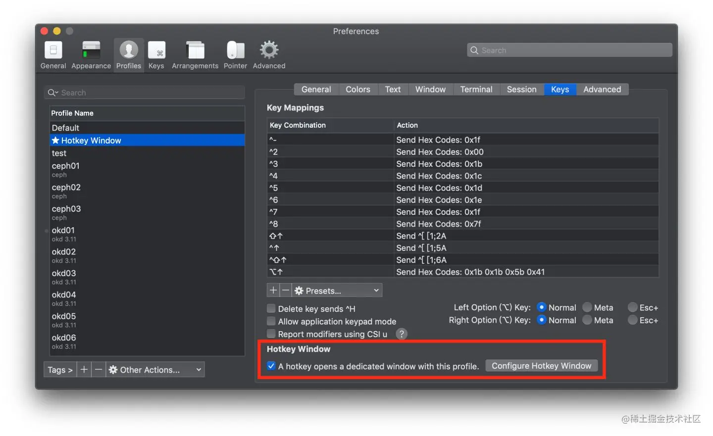 在 Preperence → Profiles → Keys → HotKey Window 进行设置