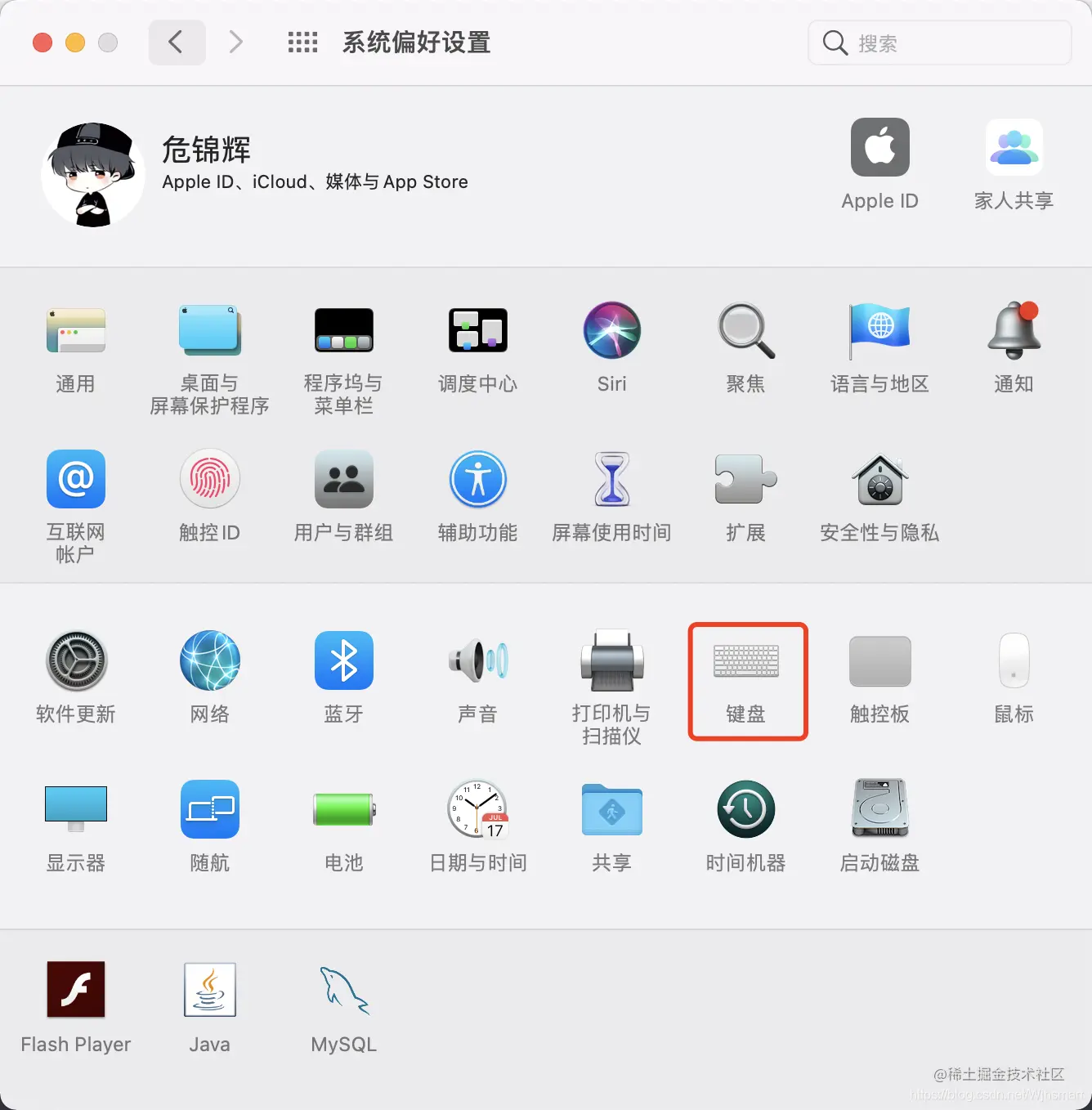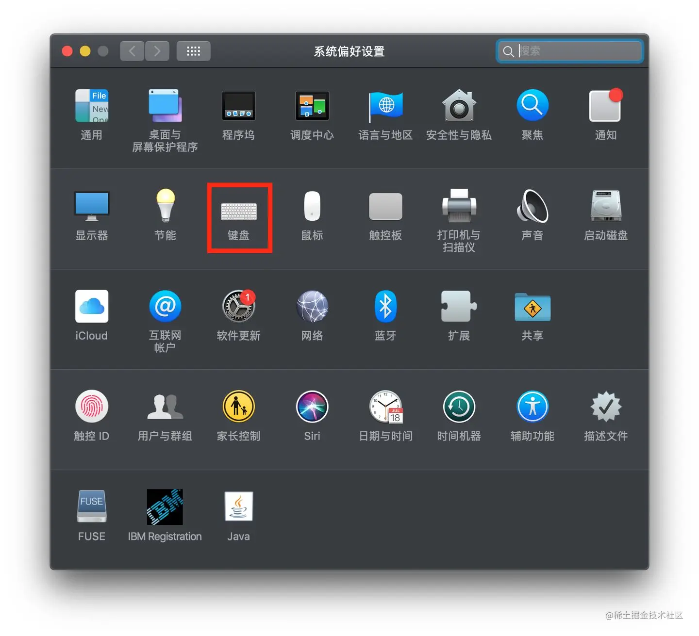 对于没有 Touch Bar 的 MacBook,我们可以这么设置,首先打开系统偏好设置,选择键盘设置。