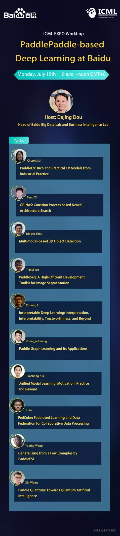 技术的发展离不开研究者潜心钻研,更需要相互交流碰撞灵感火花。本次百度举办的ICML 2021 Expo包含十个主题演讲,期待与全球AI顶尖人才展开广泛交流与学习,分享和探讨百度飞桨最新技术成果与应用心得。