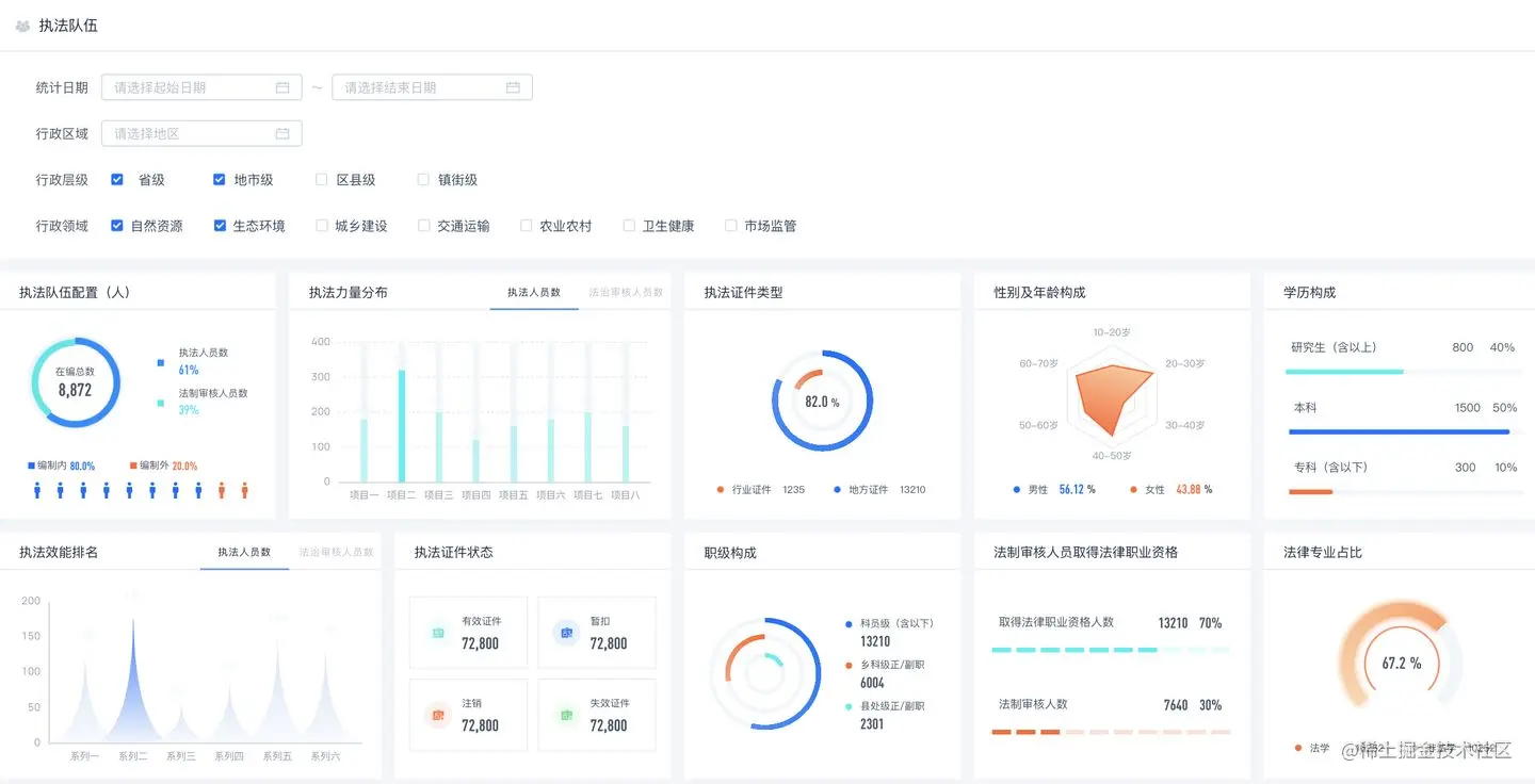 例如下图通过EasyV数据可视化搭建的看板,通过柱状图、条形图、饼图的组合,可以快速了解业务信息,掌握业务趋势。