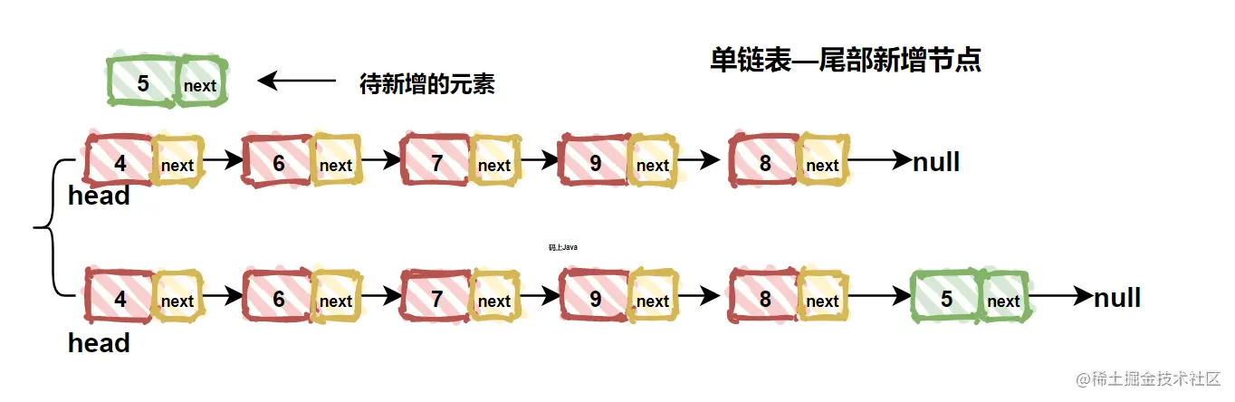 我们先来看看最简单的尾部新增的情况,只需要遍历链表,如果当前结点的next指向null 的话,就直接该结点的next指针指向新增的这个结点就可以了。如下图所示: