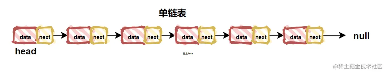 图中我们可以发现,在单链表中每个单节点都包含两部分,也就是上面我们说的data和next。这里就不再解释了。除此之外,还有一个head,这个是什么呢? 这个其实是头结点,也就是链表的第一个节点。同样道理,链表最后一个结点我们称为尾结点,尾结点比较特殊,它的next指针是指向null的,也就是表示链表的最后一个结点。