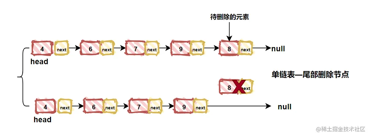 我们先来看看最简单的尾部删除的情况,当遍历到链表倒数第二个结点的结点,直接将该结点的next结点指向null即可。如下图所示: