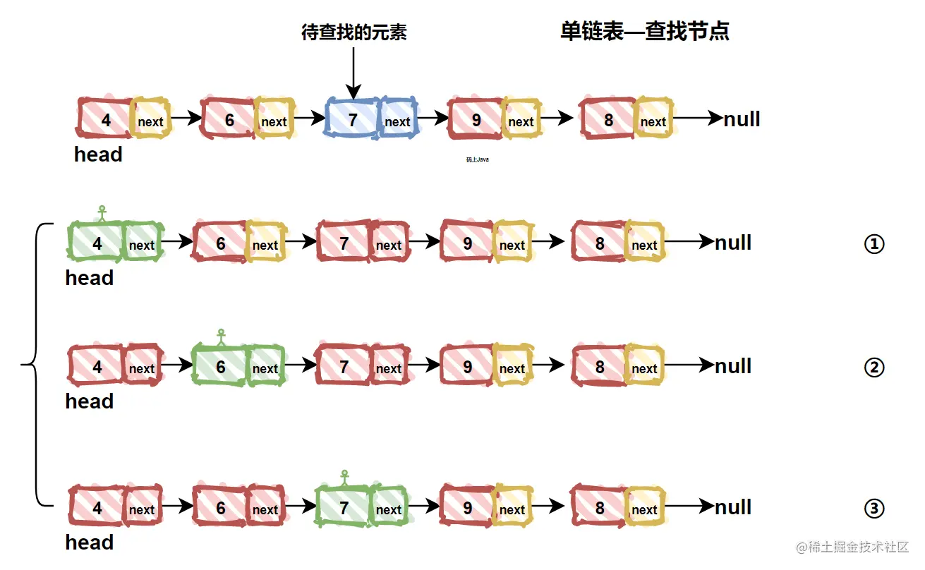 当数组在查找元素的时候,可以通过下标快速定位到对应元素。但是链表可没这个能力,在链表中查找某个元素,只能从头结点开始一个个向后查找,直到找到要查找的元素或者找不到。由于从头开始遍历,故时间复杂度为O(N)。链表查找结点过程如下图所示: