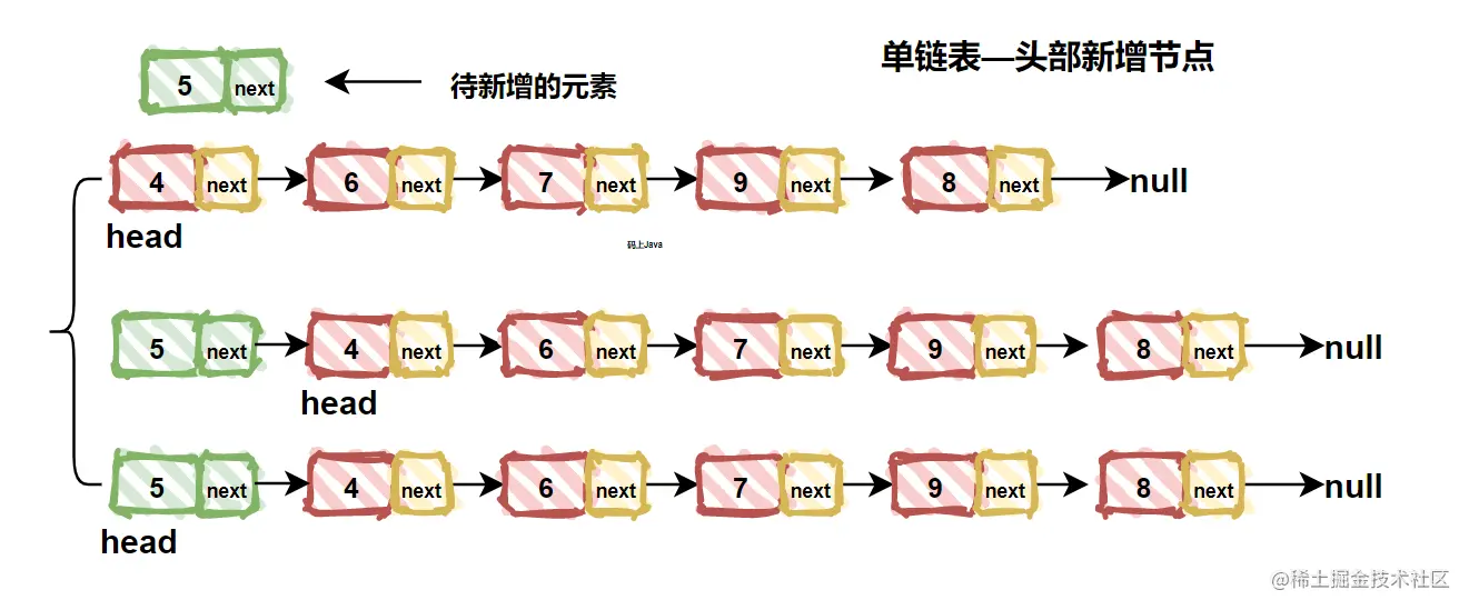 链表中新增结点需要考虑三种情况,分别是:头部新增、中间新增、尾部新增。