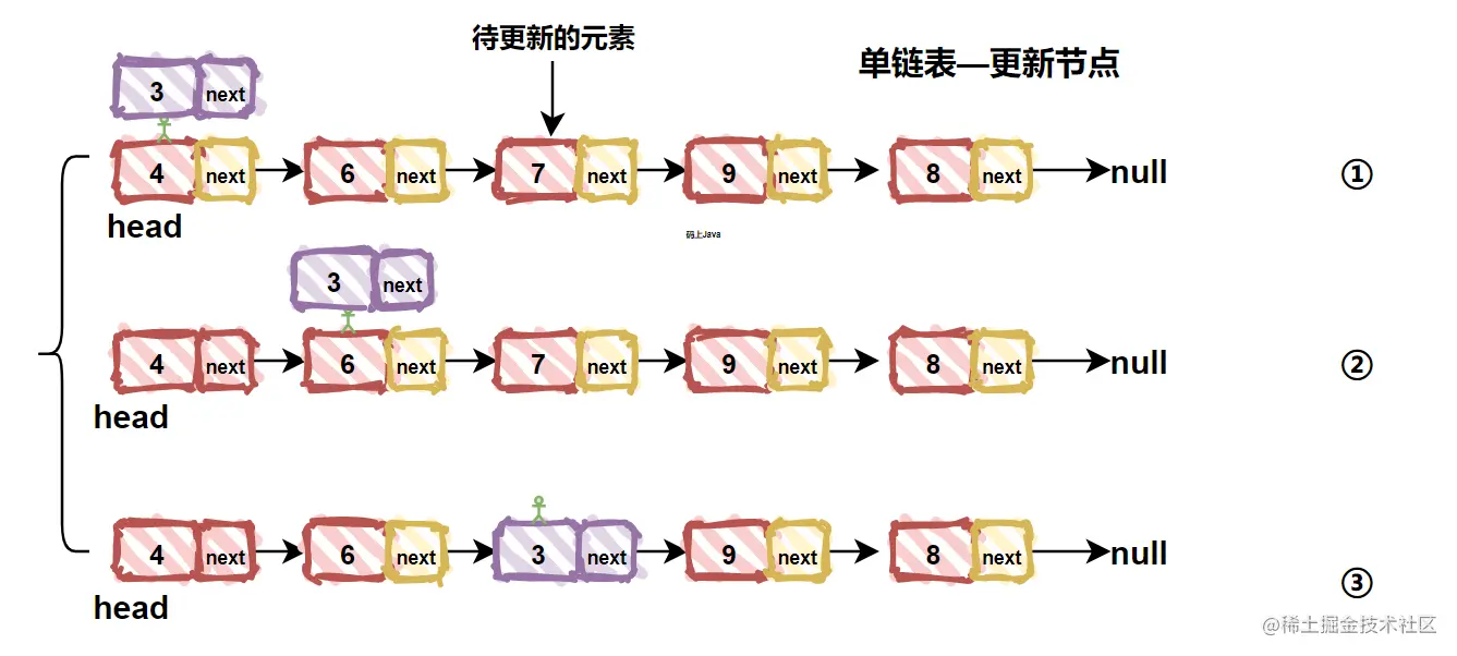 链表中更新结点如查找过程类似,也是从头开始遍历,找到要更新的结点那个位置,然后直接赋值就可以了。链表更新结点过程如下图所示: