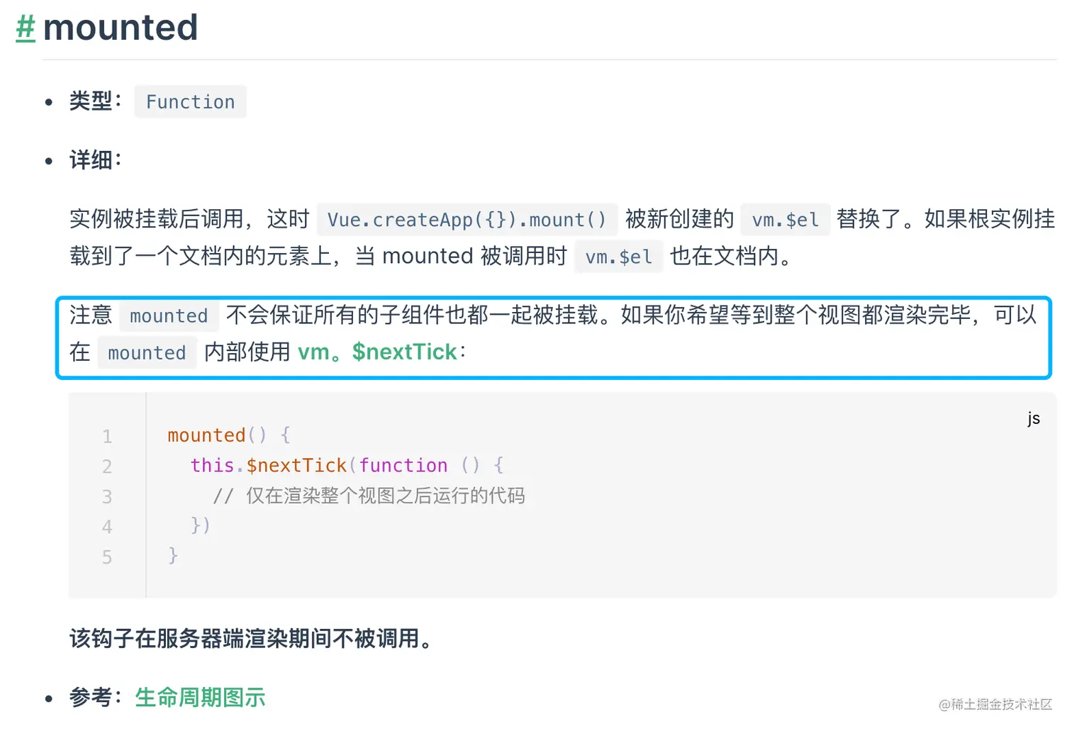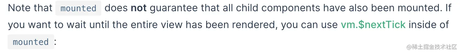 相信大家对这个生命周期不是很陌生,当Vue实例被挂载完成后触发该钩子函数。在官方文档中对这个钩子函数的描述还附加了一条注意点。
