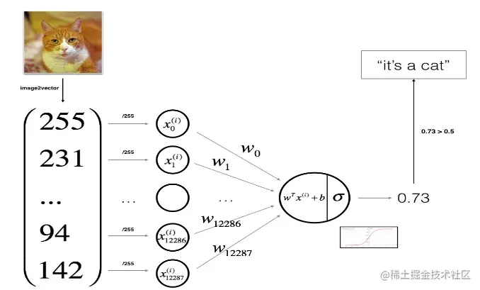 sigmoid函数的作用就是把预测结果转换为0和1之间的值。在该模型中把运算结果转换为图片中有猫的概率。