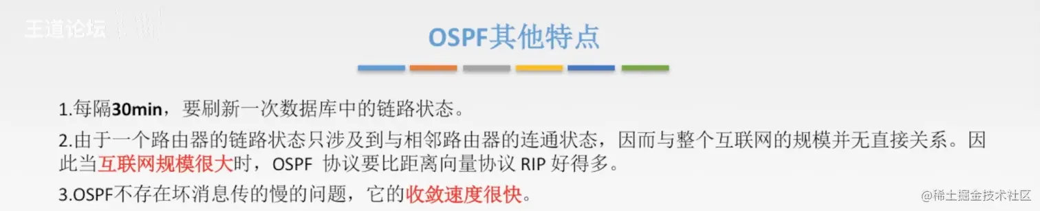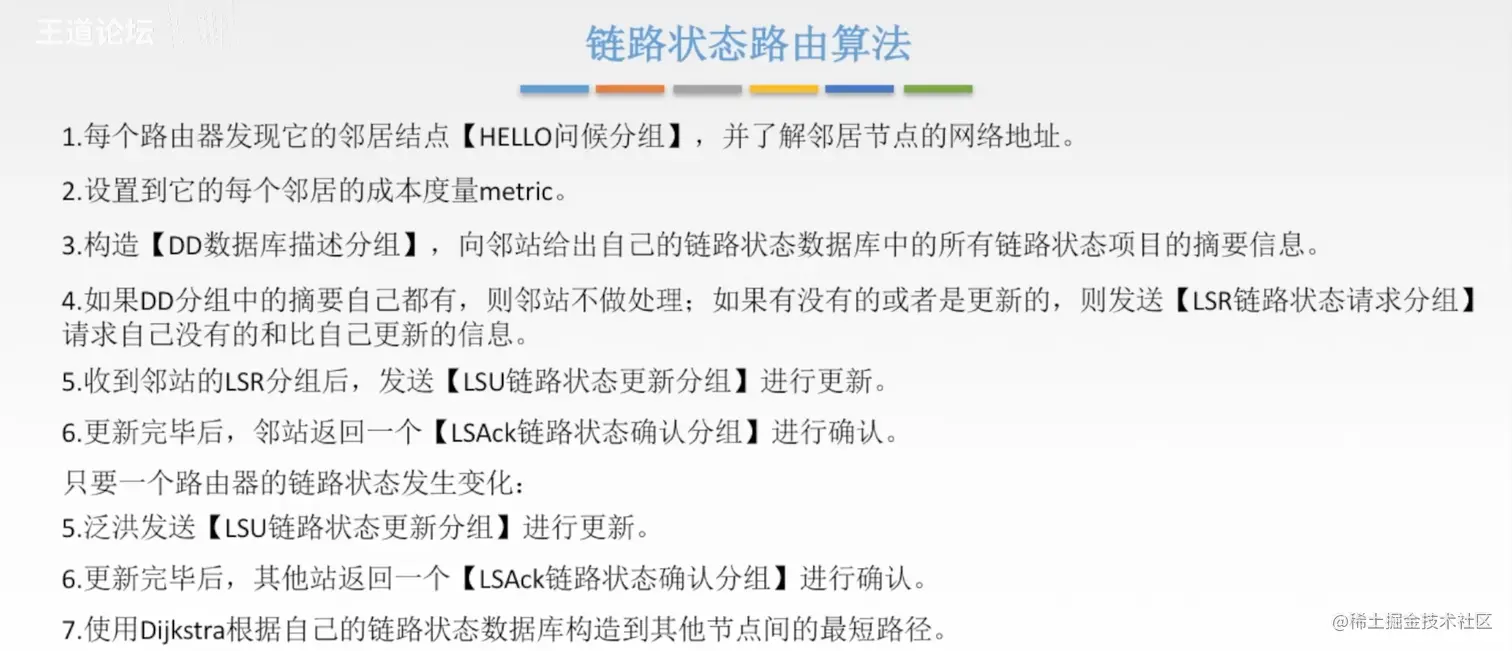 - 交换什么?相较于RIP协议,相邻路由器交换自己完整的路由表,这个路由表包换 到目的地址的最短距离 和 下一条的路由器;OSPF交换的信息是 此路由器的相邻路由器 和 链路的度量(自定义:费用、距离、时延和带宽等信息)