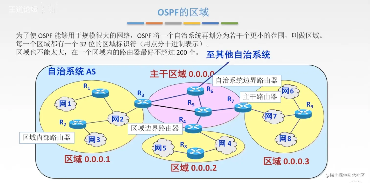 - 主干区域内的路由器都叫做 主干路由器R5、R6,也包含衔接 主干区域和区域的路由器,比如R3、R4、R7,他们此外也叫 区域边界路由器