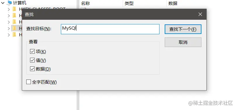 打开命令提示符窗口 --> 输入 regedit 打开注册表编译器 --> 使用Ctrl+F搜索(MySQL)--> 删除其中的 imagePath