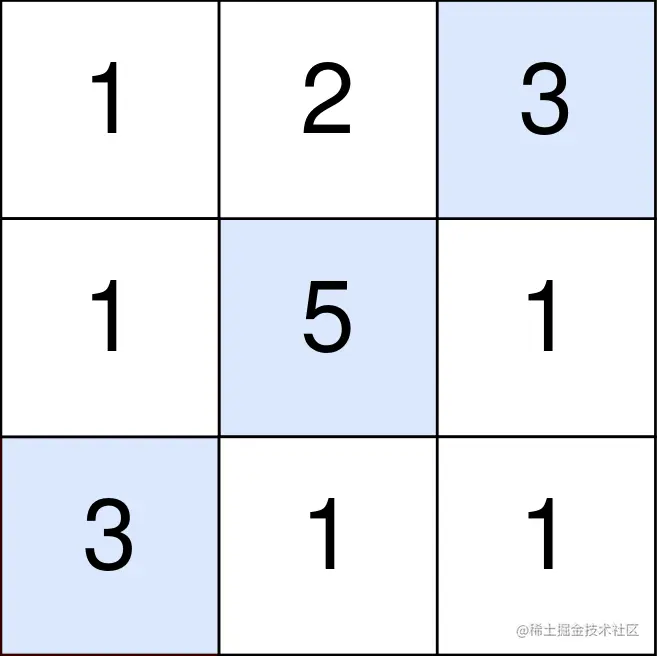 输入:points = [[1,2,3],[1,5,1],[3,1,1] 输出:9 解释: 蓝色格子是最优方案选中的格子,坐标分别为 (0, 2),(1, 1) 和 (2, 0) 你的总得分增加 3 + 5 + 3 = 11 。 但是你的总得分需要扣除 abs(2 - 1) + abs(1 - 0) = 2 你的最终得分为 11 - 2 = 9