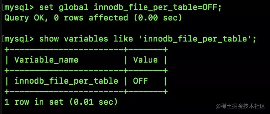 接下来我们执行如下代码,修改 innodb_file_per_table 的值为 OFF,即关闭独立表空间,如下: