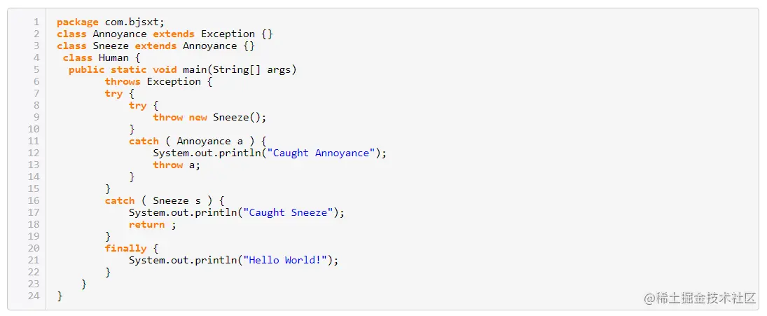5)catch语句块执行完后程序会继续执行finally语句块。