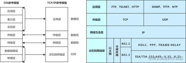 ISO制定的OSI参考模型的过于庞大、复杂招致了许多批评。伴随着互联网的流行,其本身所采用的TCP/IP协议栈获得了更为广泛的应用和认可。在TCP/IP参考模型中,去掉了OSI参考模型中的会话层和表示层(这两层的功能被合并到应用层实现)。同时将OSI参考模型中的数据链路层和物理层合并为主机到网络层。