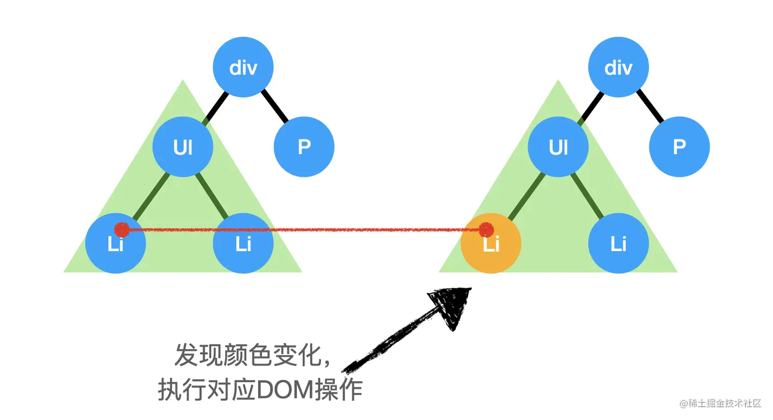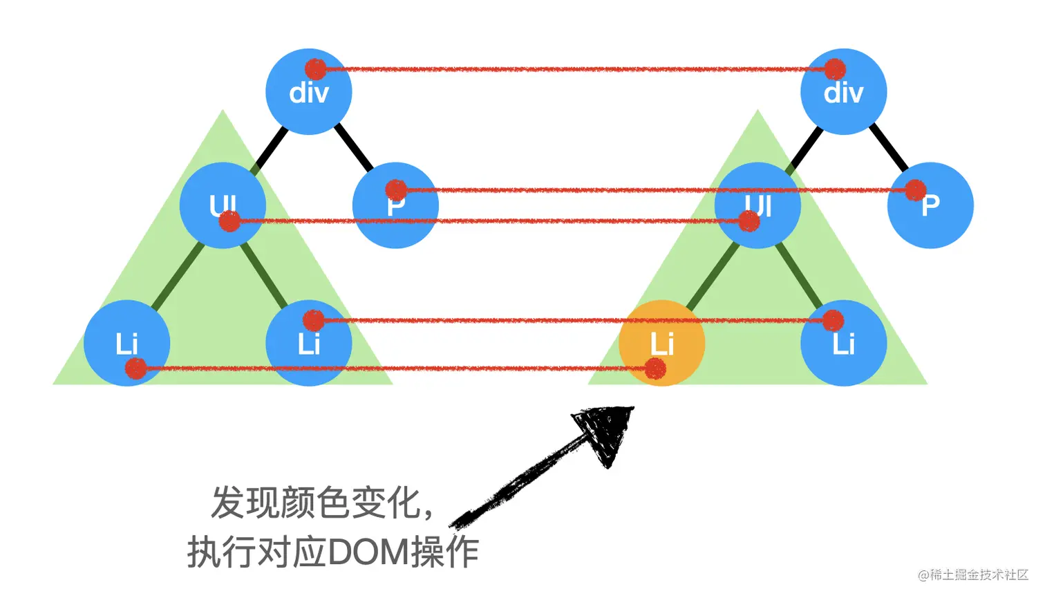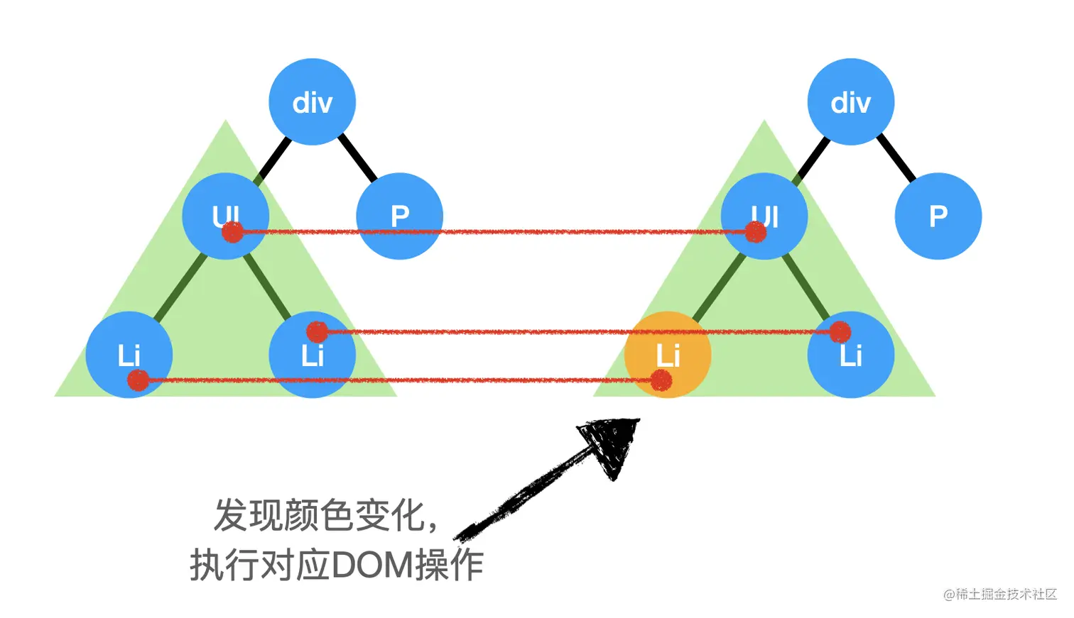 树级更新的框架会再生成一棵完整虚拟DOM树,生成过程中与之前的虚拟DOM树对应节点进行比较: