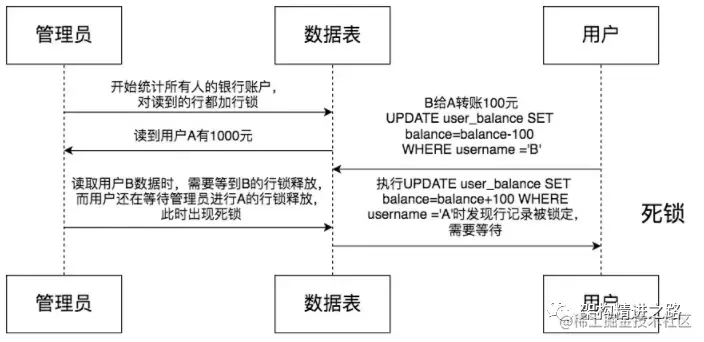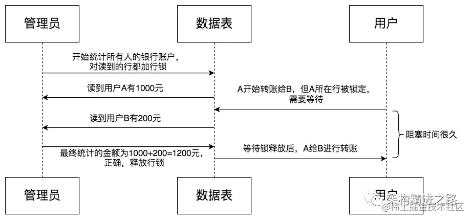 用户 A 和用户 B 之间进行转账,此时数据库管理员想要查询 user_balance 表中的总金额,两个场景存在并发情况,在没有MVCC的情况下,会出现哪些问题呢。