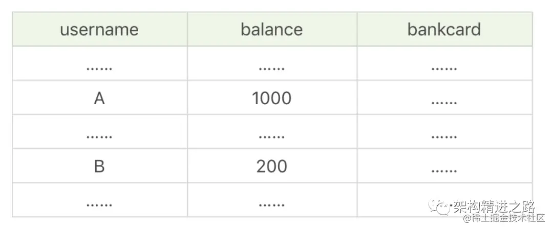 假设有个账户金额表 user_balance,包括三个字段,分别是 username 用户名、balance 余额和 bankcard 卡号,表数据如下所示: