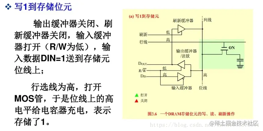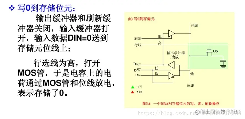 DRAM存储器的存储位元是由一个MOS晶体管(起开关作用)和一个电容器(充满电荷为1,没有电荷为0)组成的记忆电路。