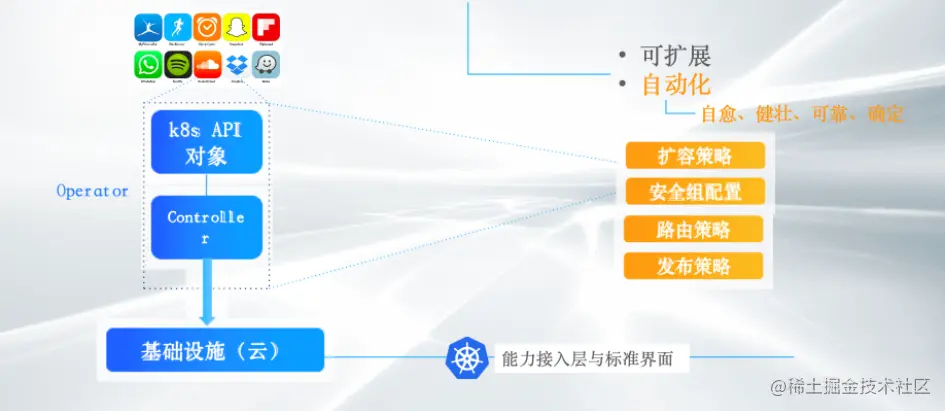 那么这也是我们今天在 K8s 安卓化的背景下看到的另外一个趋势,就是我的应用本身和业务所需要的能力会不断地往自动化方向去演进。这也非常符合云原生的理念,因为你的应用自动化和自愈能力越强,你就越能够去跟云去对接,人工需要去记录的成本会更低,时间也会更少,更多的是把我的自动化能力跟云去对接好,让云帮助我去解决所有问题。
