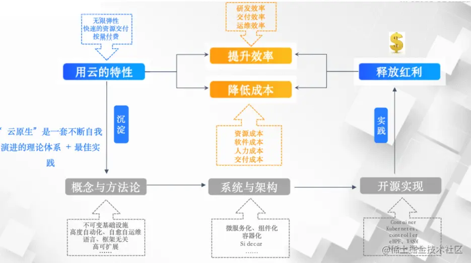 总体而言,你会发现这一套云原生的方法其实是一个很完善的闭环,先不断去地看、不断地去探索如何利用云的特性帮助用户去提效降本,然后把这一系列的方法或者这一系列的思想,总结沉淀成为云原生的概念和方法论,再通过一系列相应的架构和对应的开源项目将其实现,最后再让用户能够去使用这些技术,从而达到释放云计算红利的本质目的。