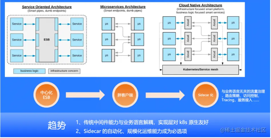 今天,中间件能力不断通过这样一个方式在下沉,它会带来一个非常明显的趋势,即中间件不再与业务相关了,不再与程序的编写语言相关了,也不需要对框架有什么依赖。它的实现跟 K8s 容器化这套体系会非常的紧密结合。另外,我对 Sidecar 的依赖也会更多,所以说相应的对 Sidecar 的管理能力也在逐步去提高要求。我们可以把它总结为应用中间件能力的进一步下沉。