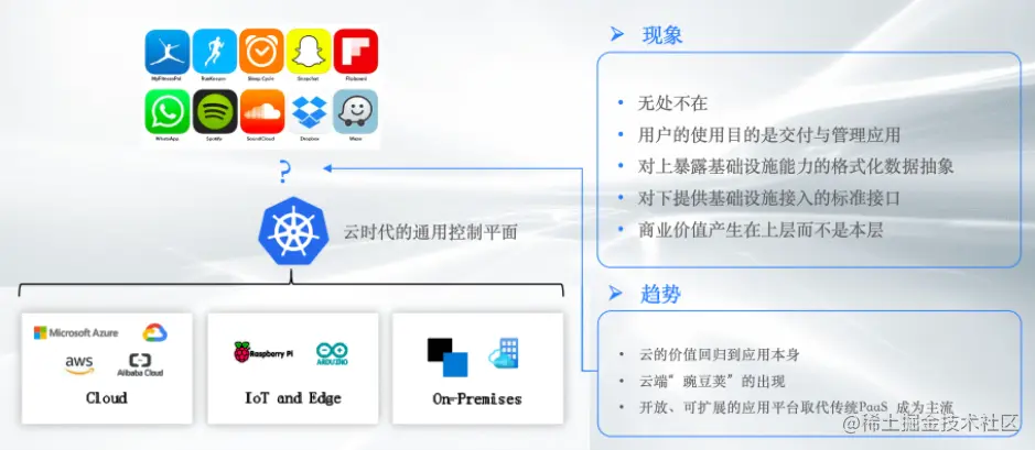 今天的云原生可能是围绕着容器和 Kubernetes 来构建的,而这样的项目实际上在帮助我们去实践很多云原生背后的本质思想,包括不可变基础设施、自动化等。今天 Kubernetes 被认为是一个云时代的通用控制平面,也有人把它叫做操作系统,就是说你的所有操作都可以借助 Kubernetes 在云上统一去完成。