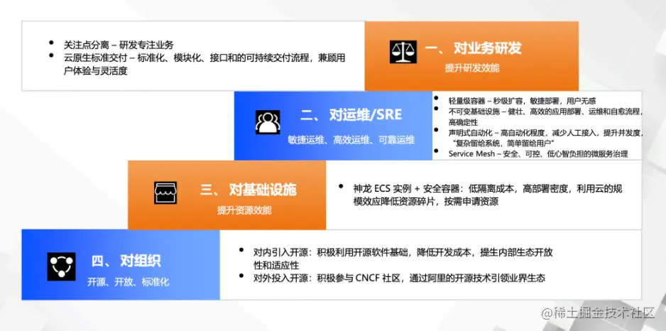 第一个我们对业务研发,通过前面讲到的云原生的思想,很好地做到了关注点分离,研发更专注于业务。通过云原生的这种标准的交付方式,我们还提出了像云原生标准交付的规范,去标准化地、模块化地进行可持续交付,兼顾用户体验和灵活度,从而大幅提升业务的研发效能,让他们完全关注于自己的业务,不需要再去接触到复杂的基础设施,这个是云原生给业务研发带来一个最大的价值。