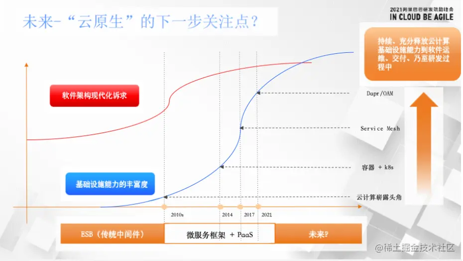 未来的整个演进趋势,它其实都伴随着一个非常重要的点,就是说云的能力在不断地越变越丰富,这是非常重要的。之所以在过去,我们的整个软件架构本身它会需要大量的,比如说传统中间件,甚至一些微服务框架或者是 PaaS,去帮助我们更好地的管理软件,它的背后非常重要的原因在于云或者说基础设施能力不够强。比如说我今天就想要一个蓝绿发布的能力,而很多云在很长一段时间内是不具备这个能力的,所以必须通过某种中间件或者某种框架来帮你去解决,但今天不是这样。今天我们的云几乎能做到你想象到的任何一种应用所需要的管理能力,甚至应该说云的能力其实已经几乎要超出了我们今天软件架构的大部分需求。所以在这种情况下,我必然不再需要一个额外的层,无论是传统中间件,还是传统的这种微服务框架或者 PaaS,去帮助弥补软件的诉求跟基础设施之间的鸿沟。