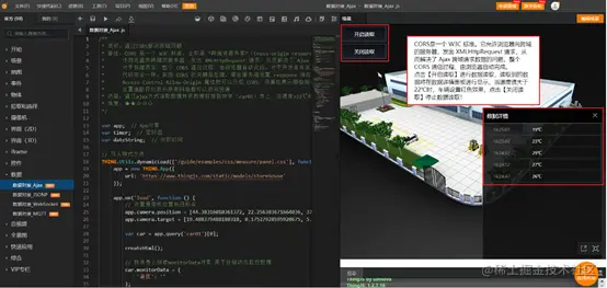 基于数字孪生可视化场景,使用在线开发或离线开发SDK进行数字孪生可视化场景开发完毕后,在所开发的数字孪生可视化可视化应用中,对接物联网或业务数据,实时驱动数字孪生可视化场景动态变化或图表数据更新。ThingJS支持以下四种数据对接方式,可与第三方物联网系统进行通信(数据传输),分别为Ajax、JSONP、WebSocket、MQTT。