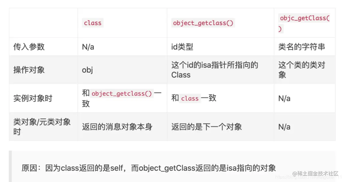 20. iOS 中内省的几个方法?class方法和object_getClass、objc_getClass方法有什么区别?
