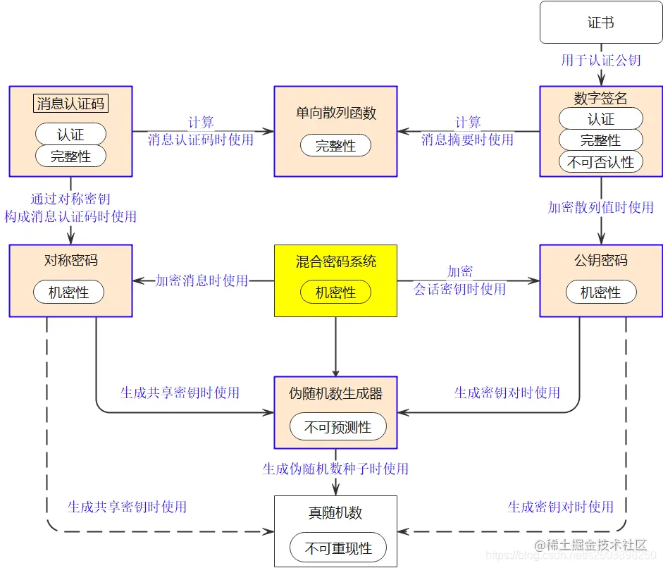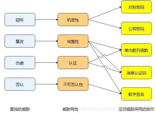 我们将信息安全领域所面临的威胁和应对威胁所采用的密码技术绘制成下图:
