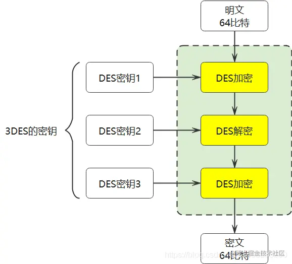 DES算法的实质密钥长度是56比特,因此3DES的密钥长度就是56x3=168比特,分组长度保持不变,依然位64比特。3DES的处理流程并不是进行3次DES加密,而是按照:加密**->解密->****加密**的过程进行处理的。之所以采用这种方式,是为了将3DES兼容DES算法。因为当3DES的三把密钥完全相同时,经过加密--解密--加密流程,实际上相当于经过一次加密,与DES的效果是相同的。也就是说3DES向下兼容DES算法。
