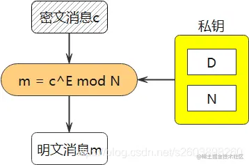 也就是说我们求出密文的D次方,然后对N求余便可以实现报文的解密。而这里的(D,N)就是解密密钥。