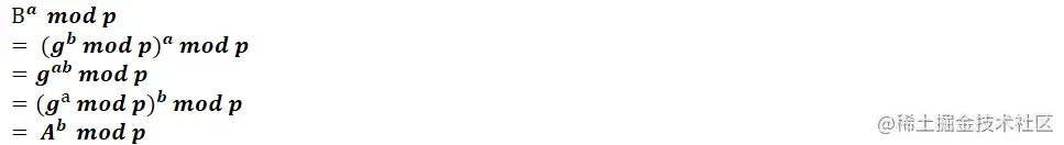 如果对于mod运算规则不清楚,可以将mod运算转换为基本加减乘除运算,然后利用二项式展开来证明双方计算的共享密钥相等。可以参考:DH算法图解+数学证明