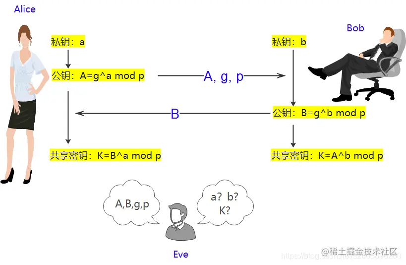 从上面DH交换中可以知道,监听者可以获取的公开信息有A, B, g, p。