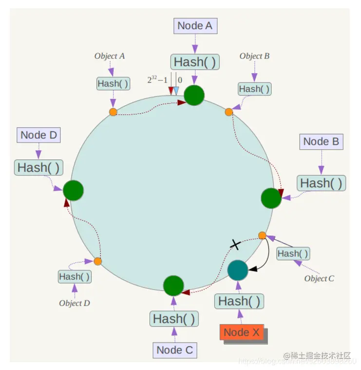 此时对象Object A、B、D不受影响,只有对象C需要重定位到新的Node X 。一般的,在一致性哈希算法中,如果增加一台服务器,则受影响的数据仅仅是新服务器到其环空间中前一台服务器(即沿着逆时针方向行走遇到的第一台服务器)之间数据,其它数据也不会受到影响。