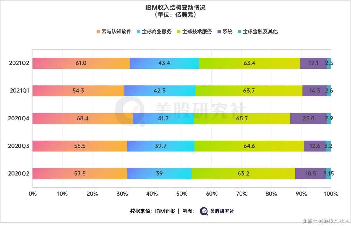 在收入构成上,IBM的Q2成绩还是可圈可点的,主要是云业务带来的增长明显,为主力版块实现了赋能式增长。具体来看: