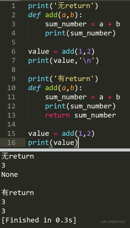 注意:return 返回值只能通过 print 打印才会显示出来,但在交互式模式下不需要 print 打印