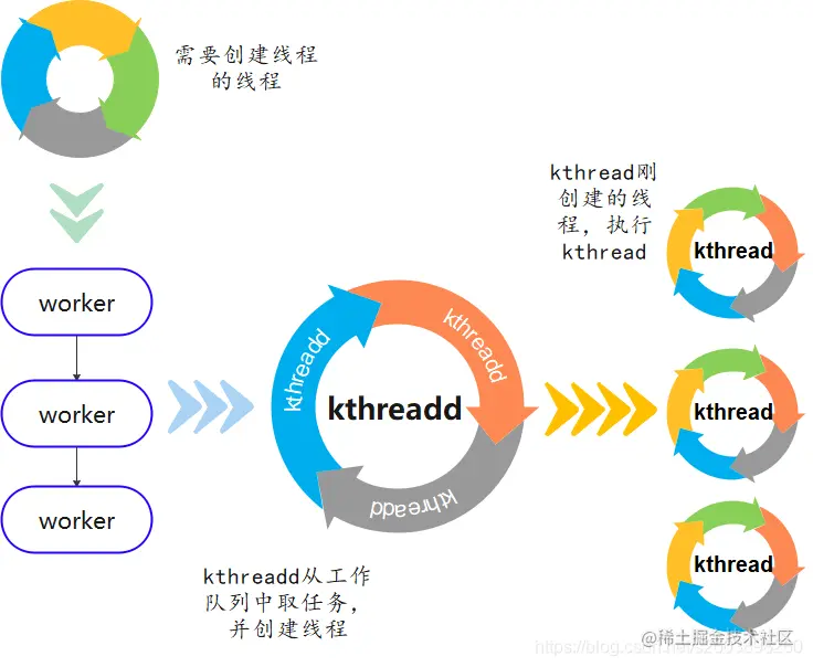 ①某一个线程A(左上那个圈)调用kthread_create函数来创建新线程,调用后阻塞;kthread_create会将任务封装后添加到kthreadd监控的工作队列中;