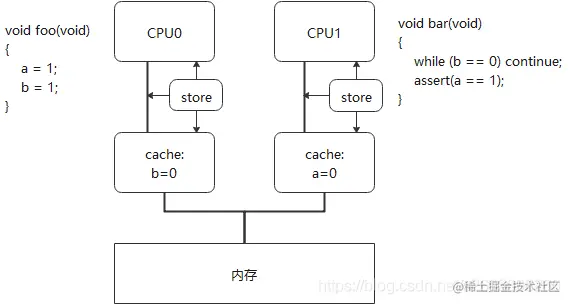 假设变量a在CPU1-cache中,b在CPU0-cache中。CPU0执行foo(),CPU1执行bar()。