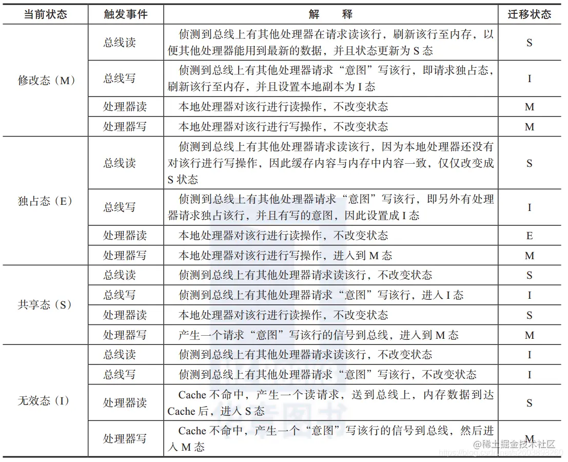 MESI 协议是 Cache line 四种状态的首字母的缩写,分别是修改(Modified)态、独占(Exclusive)态、共享(Shared)态和失效(Invalid)态。 Cache 中缓存的每个 Cache Line 都必须是这四种状态中的一种。
