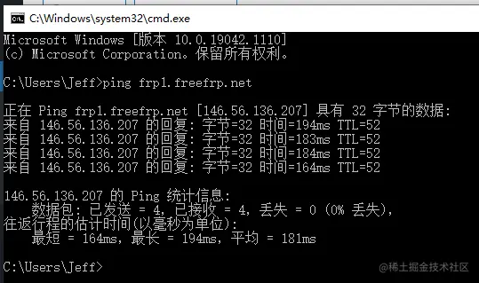 win+R,打开cmd,ping命令测试。以frp1.freefrp.net线路举例测试。