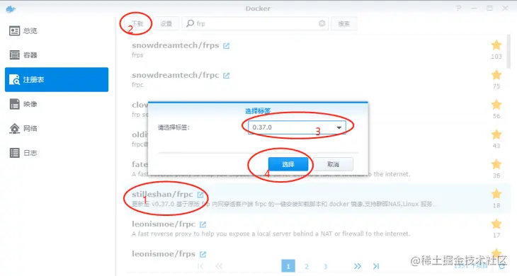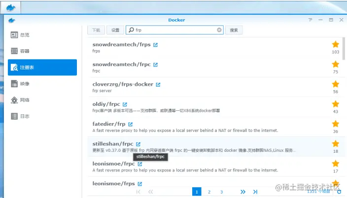 4.1 进入群晖,打开docker,左列“注册表”里搜索“frp”