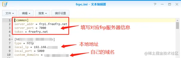 3.2 编辑frpc.ini文件,具体可参考www.ioiox.com/archives/26…